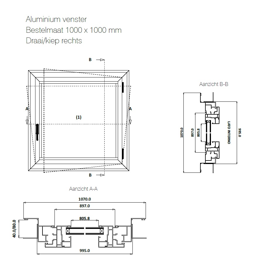 Het draaikiep raam wordt uitgevoerd in de maat 1000 x 1000 mm, is voorzien van dubbel glas.