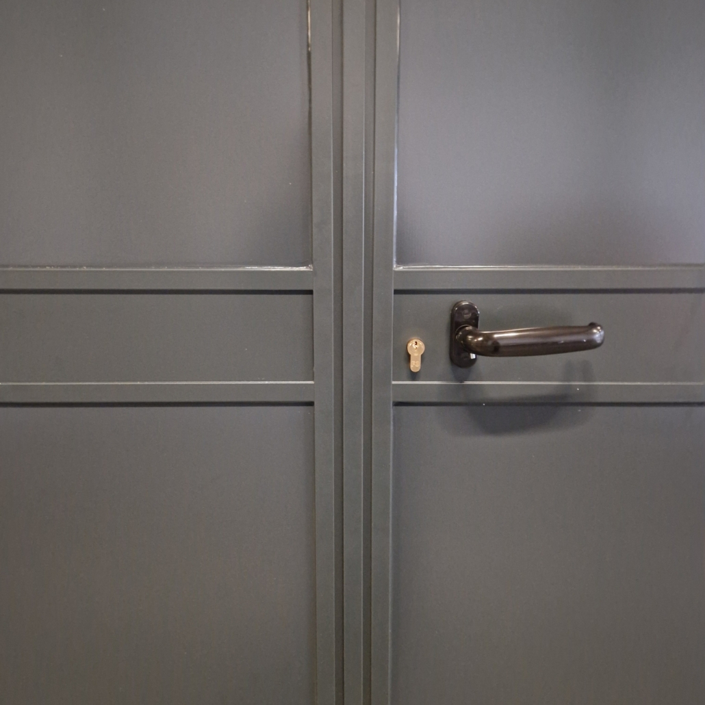 De dubbele deur wordt standaard uitgevoerd in de maat B 1000 – 1000 x H 2125 mm, met een deurbladdikte van 45 mm. Deze zijn incl. slotkast en kunststof klinkstel in de kleur zwart.