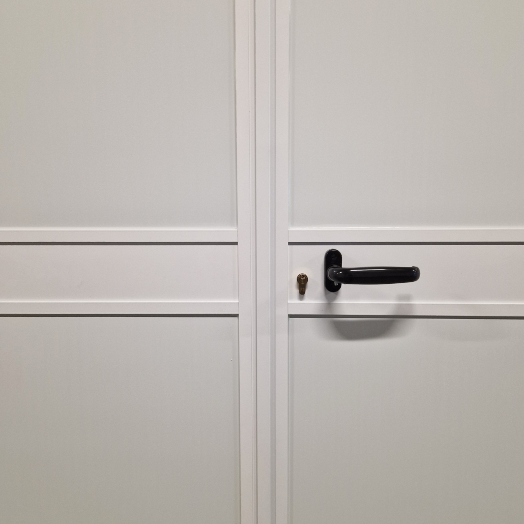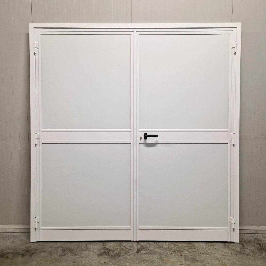 De dubbele deur wordt standaard uitgevoerd in de maat B 1000 – 1000 x H 2125 mm, met een deurbladdikte van 45 mm. Deze zijn incl. slotkast en kunststof klinkstel in de kleur zwart.